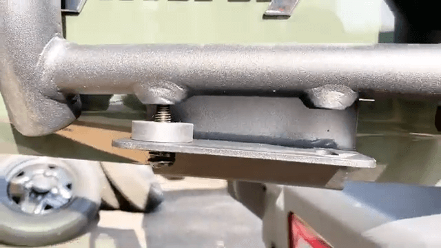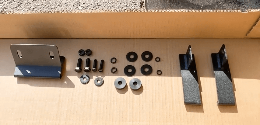 太いボルトにワッシャーを入れて外側から内側に差し込み、内側からワッシャー・スプリング・ナットで絞めていきます。ここでは仮締めで固定してください。反対側も同じように取り付けます。