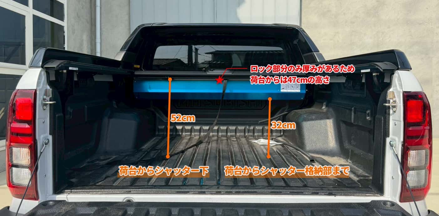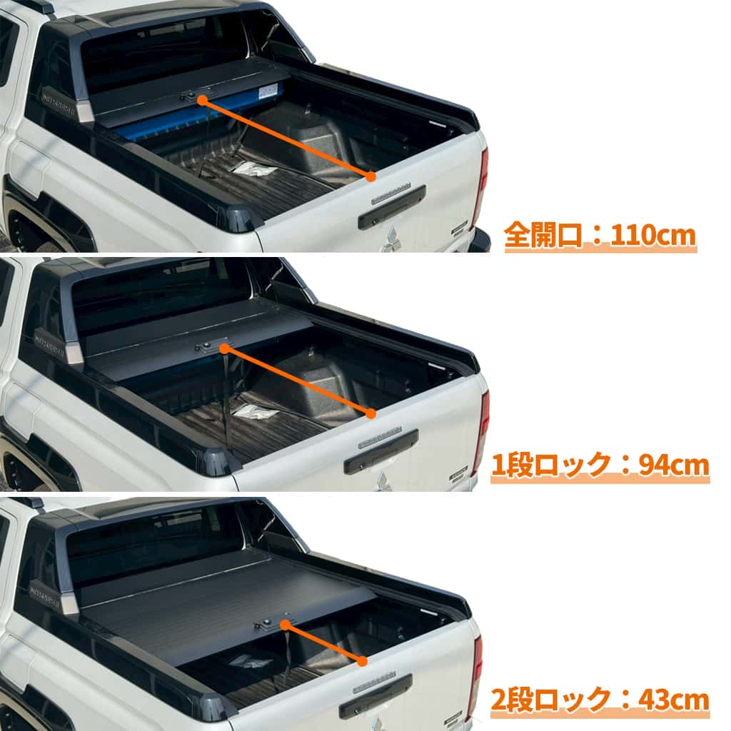 | 商品詳細3 | 荷台寸法 全開時:トノカバー先端からリアゲート内側まで:110cm 1段階目:トノカバー先端からリアゲート内側まで:94cm 2段階目:トノカバー先端からリアゲート内側まで:43cm |